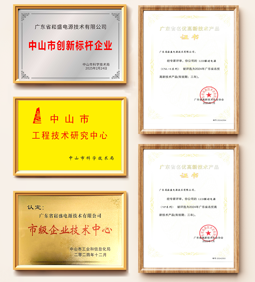 2024年,崧盛股份中山智能制造工厂——广东省崧盛电源技术有限公司接连荣膺“中山市企业技术中心”、“中山市创新标杆企业”、“中山市工程技术研究中心”,核心产品CNL-E系列与VP系列LED驱动电源同步入选“广东省名优高新技术产品”,这是崧盛股份在技术创新领域综合实力的集中体现。