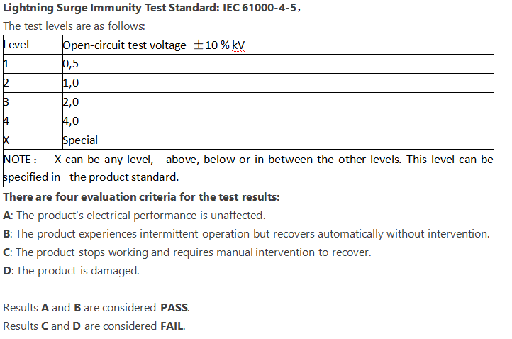 雷击浪涌测试标准为:IEC6100-4-5,等级如下